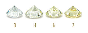 컬러 등급은 알의 색이 무색에 얼마나 가까운가를 채도와 명도에 의해 결정하고 색의 미묘한 차이를 평가하며 무색인 D 칼라를 최고의 칼라로 한다. 그외 순차적으로 E F G H I....Z까지 23등급으로 분류평가하며 그 이하는 Fancy color라 구분 평가한다. 쉽게 말해 다이아몬드 안에 질소 함량에 따라 색이 노란색이 짙을 수록 값어치는 떨어지고 노란색이 아예 없거나 연해질 수록 값어치는 올라간다.